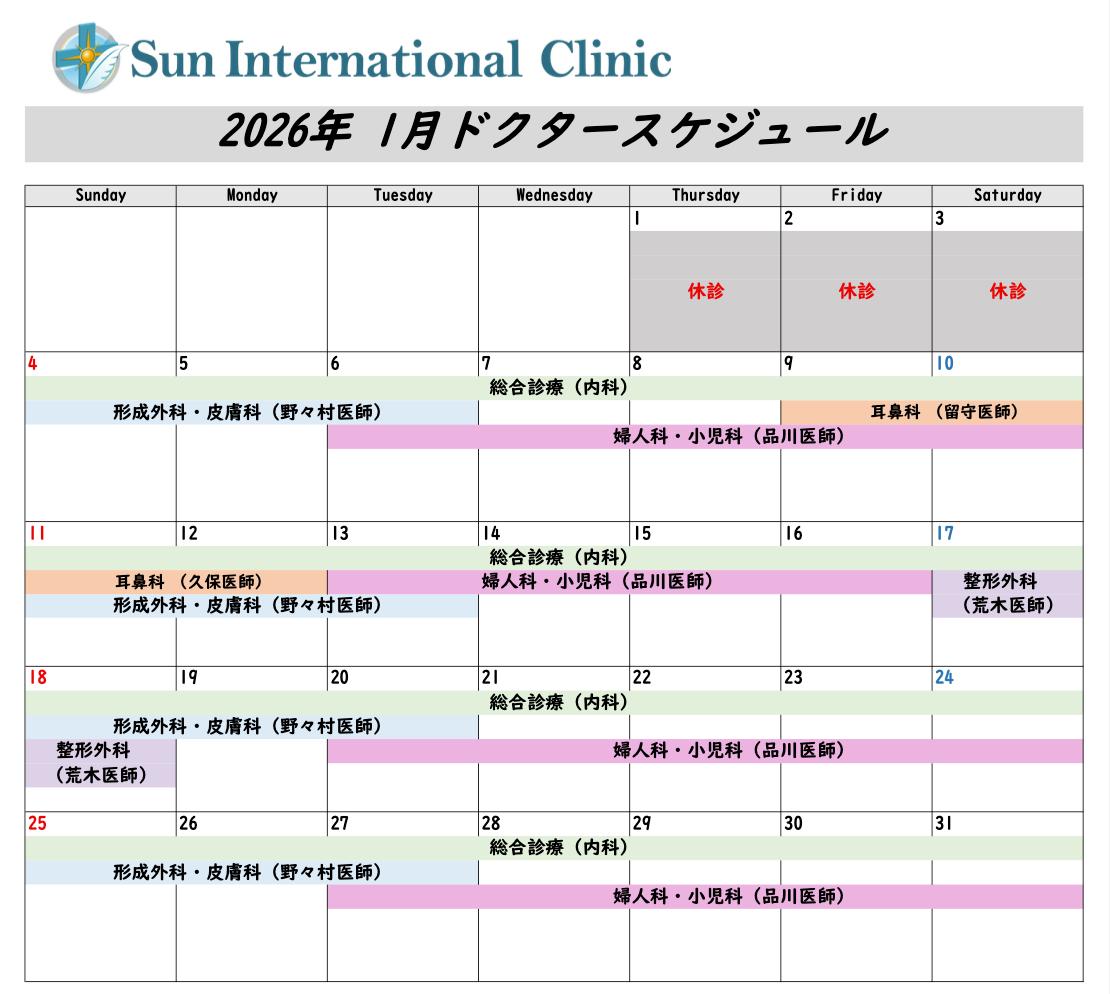 1月の専門医の診療スケジュール