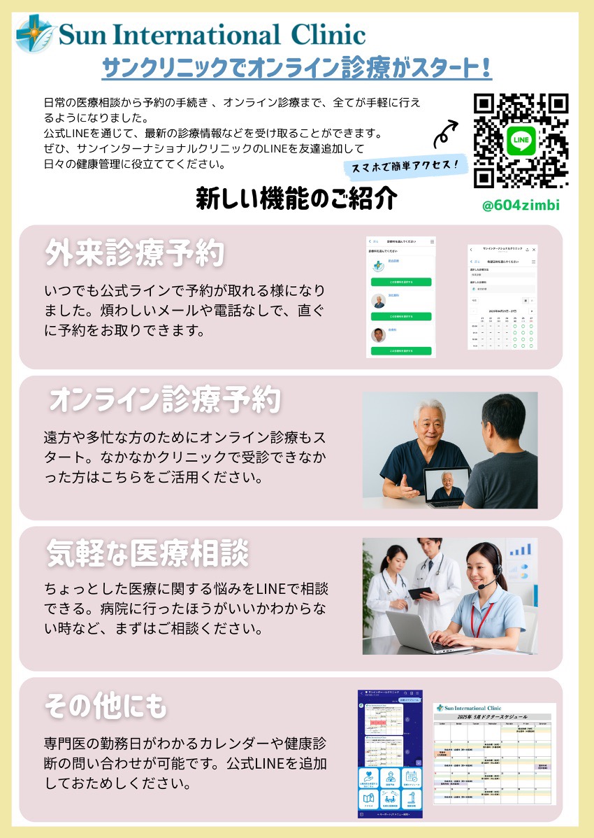 サンインターナショナルクリニックが公式LINEを開設し、LINE予約、オンライン診療を始めました。