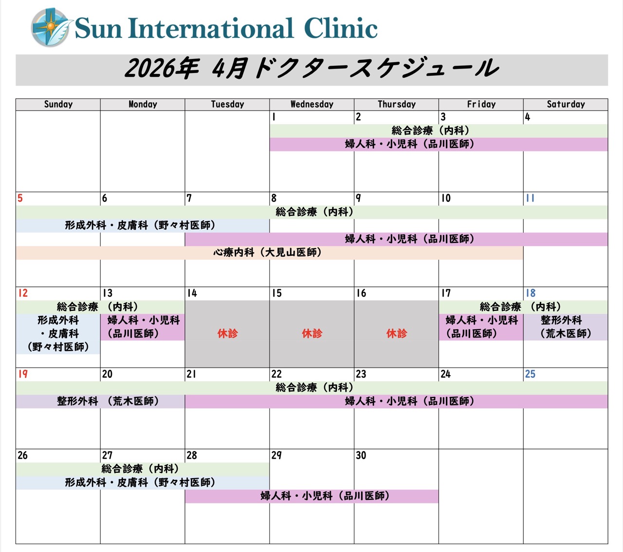 プノンペンの日系病院「サンインターナショナルクリニック」から、4月の専門医診療スケジュールをお届けします。